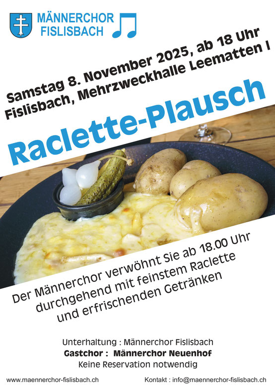 Bald ist es wieder soweit, der Männerchor Fislisbach lädt auf Samstag, 8. November 2025 zum Raclette-Plausch in die herbstlich dekorierte Mehrzweckhalle Leematten I ein.